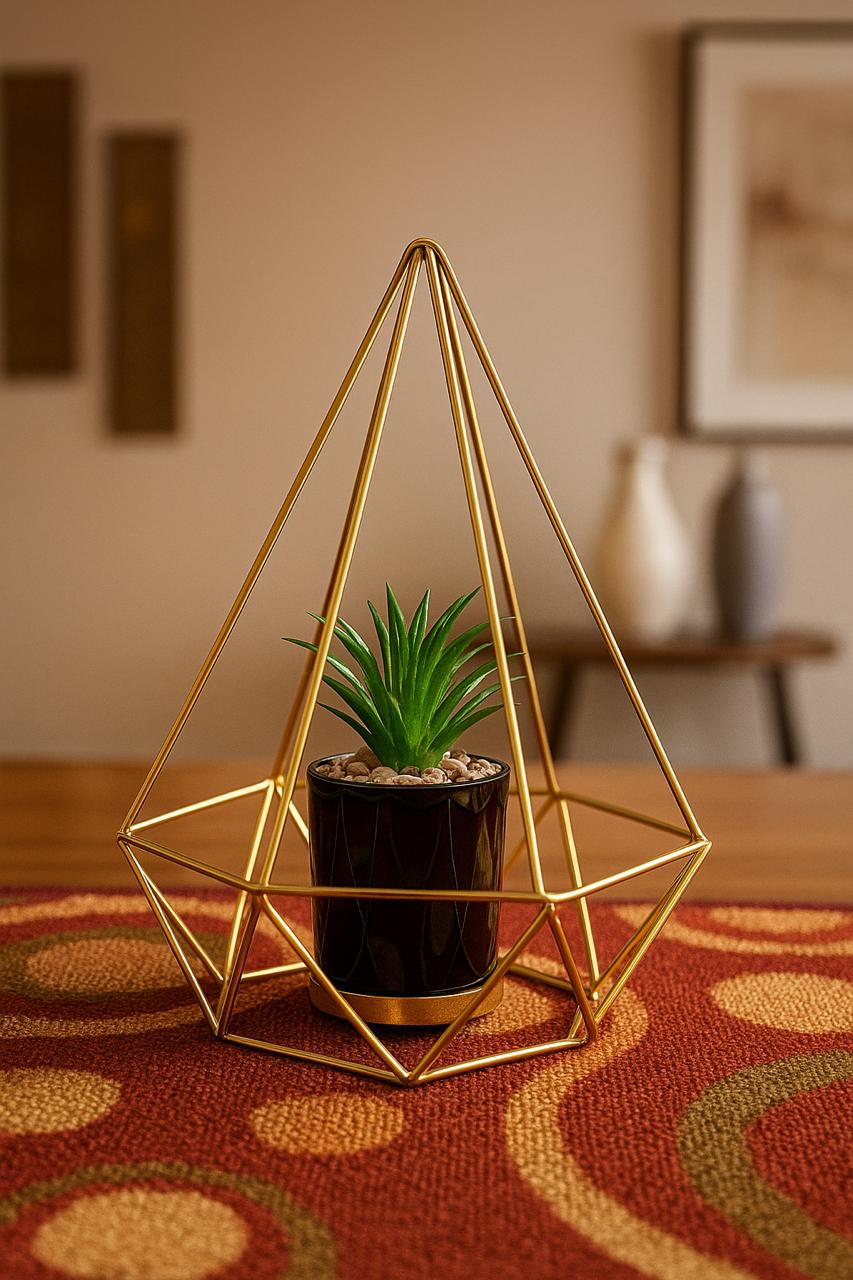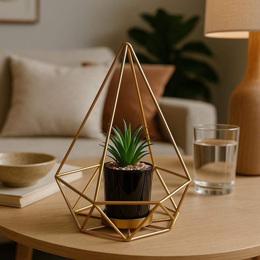 The Aurum Pyramid Table Decoration Piece is a stylish decor item featuring a black pot with a small green plant inside. The pot is surrounded by a golden metallic pyramid-shaped structure with geometric lines. It’s placed on a wooden table with a glass of water, books, and a bowl nearby. The background shows a cozy living room setup with a couch and lamp. Looks like a chic addition to any room! 😊